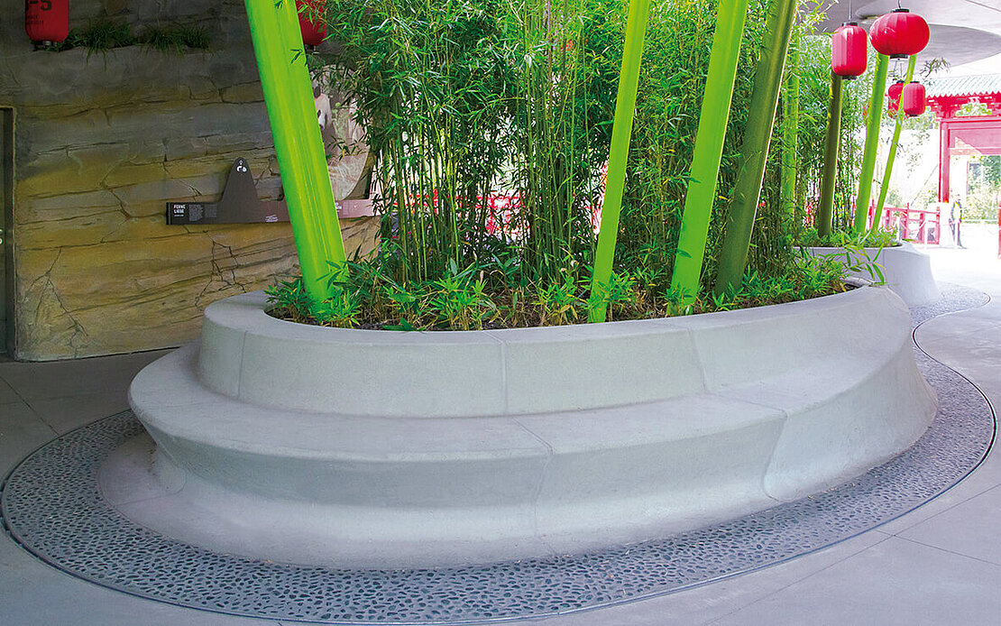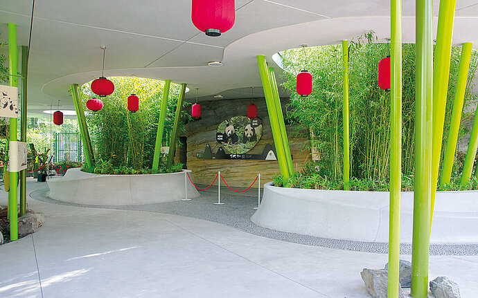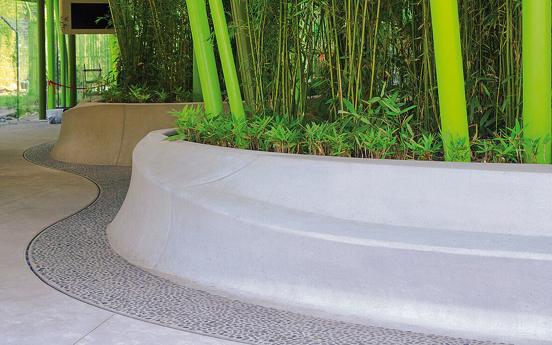 Neben dem Berliner Zoo, beherbergen lediglich sieben weitere Zoos in ganz Europa Panda-Bären. Der Besucherbereich sollte daher in einmaligem Design zum Verweilen einladen. Hierzu wurden in aufwändiger Sonderanfertigung geschwungene Formen aus Beton hergestellt. Die Herausforderung bei dem finalen Einbau runder Elemente liegt darin, einen nahtlosen Übergang zu schaffen. Das gelang Beton und Naturstein Babelsberg (BNB) zweifelsfrei. So können seit 2017 die Zoobesucher die Pandabären bestaunen, während sie auf hochwertigen Sitzgelegenheiten verweilen. Diese sind so gefertigt, dass sie gleichzeitig als Beet Einfassung in stimmigem Bambusdesign dienen.