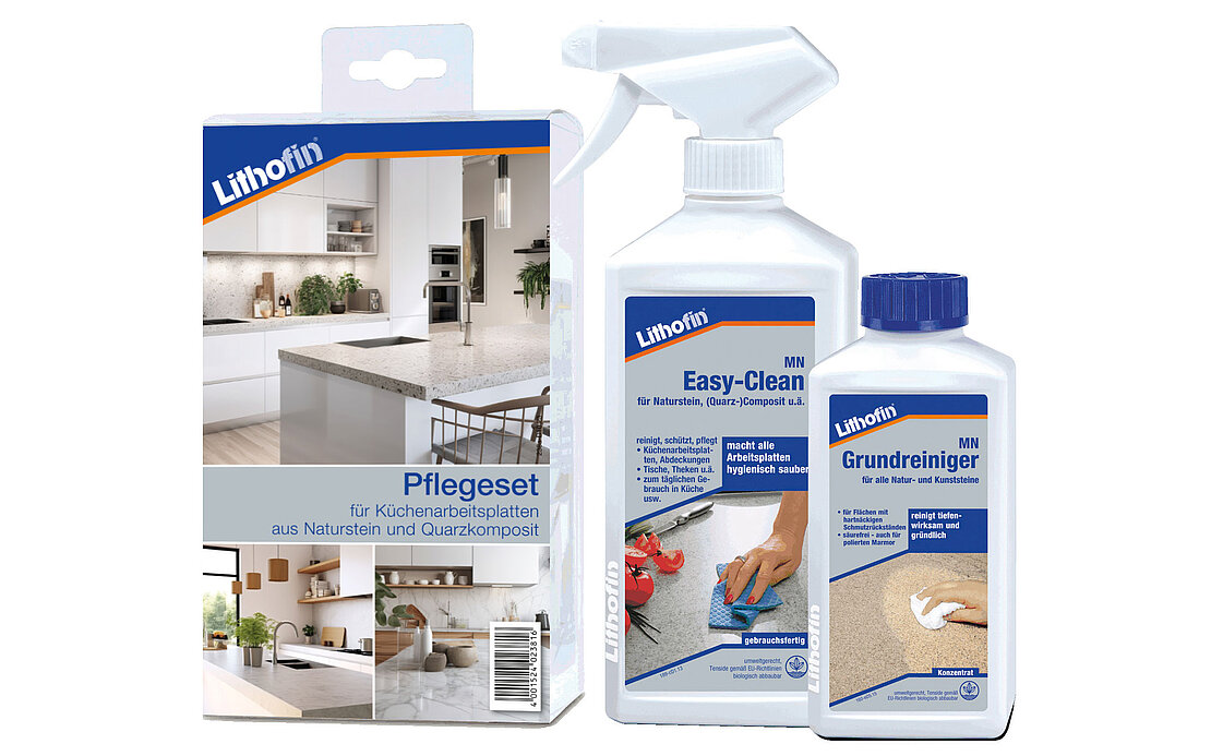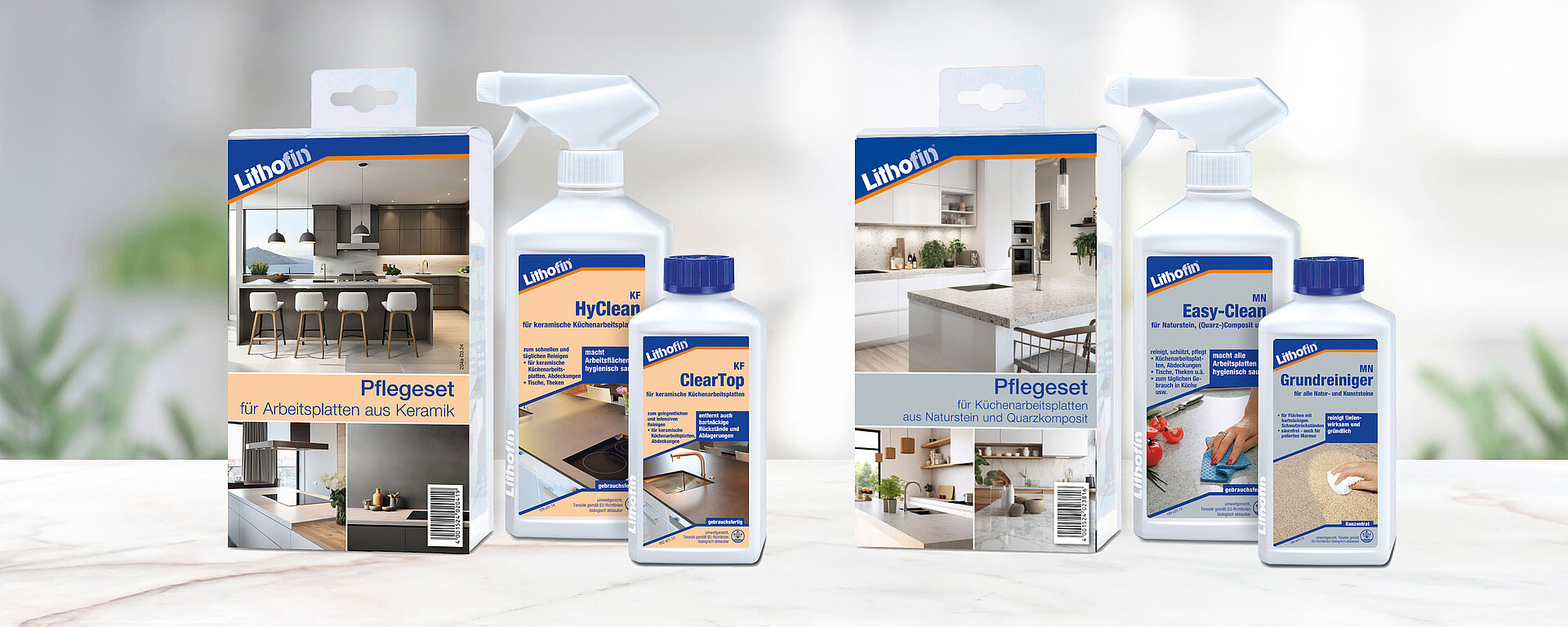 Lithofin Pflege-Sets enthalten auf das Einsatzgebiet abgestimmte Produkte wie Küchenarbeitsplatten, Bad oder Bodenbeläge.