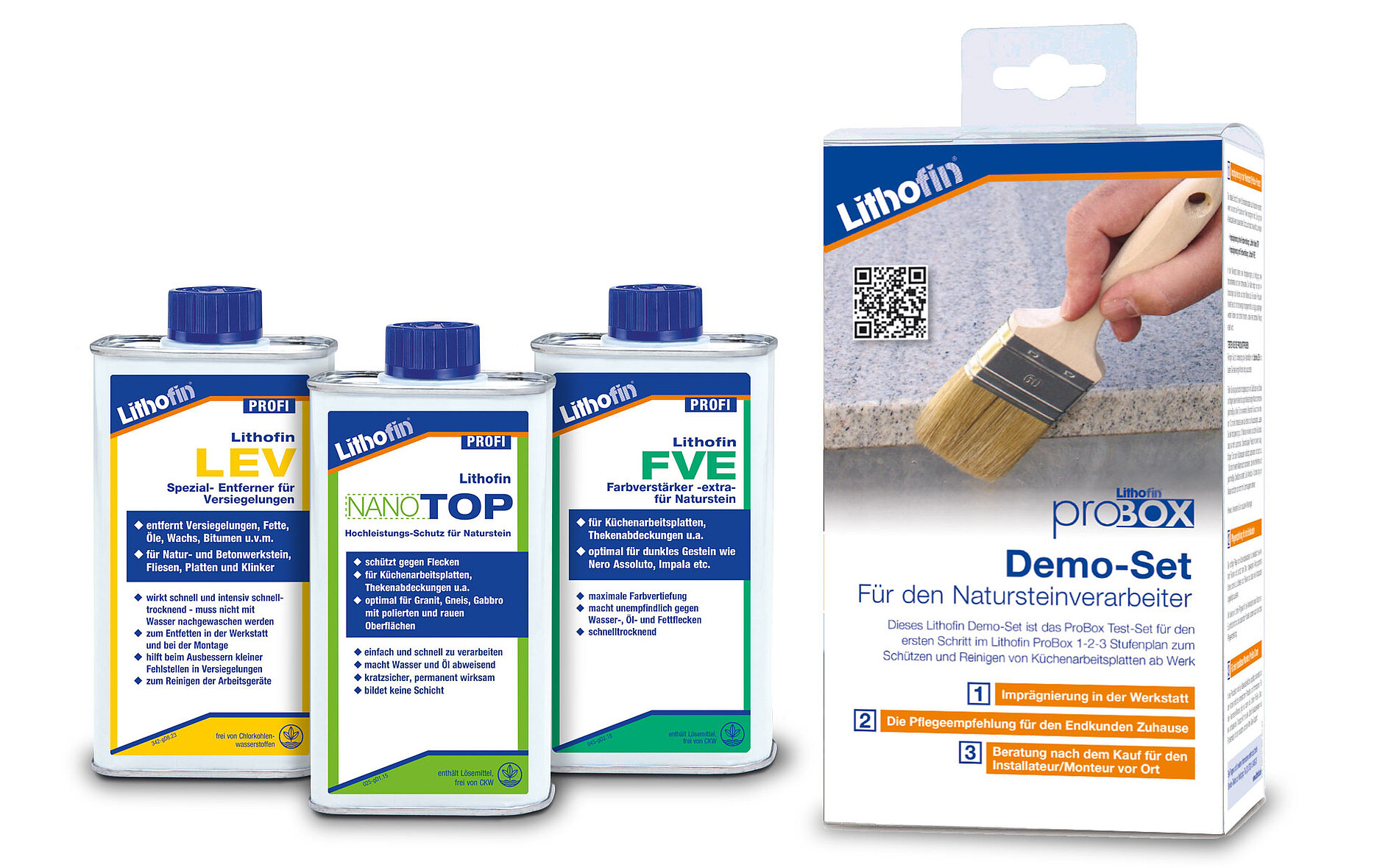 Für den einbaufertigen Zustand von Küchenarbeitsplatten sind darüber hinaus noch Reinigungs- und Schutzbehandlung erforderlich. Damit die benötigten Produkte hierfür schnell zur Hand sind, hat Lithofin das ProBox System 1-2-3 entwickelt.