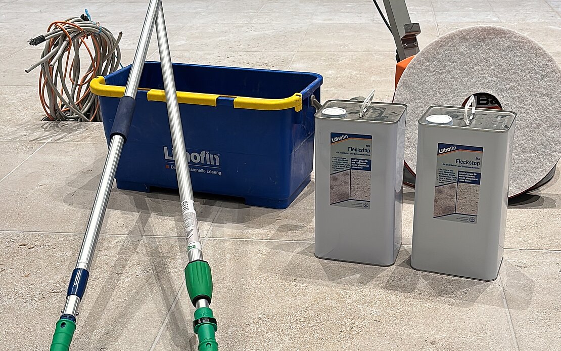 The Crailsheim shell limestone floor, finely sanded in the Pergamon Museum in the Garden Hall, was impregnated with Lithofin MN Stain-Stop.