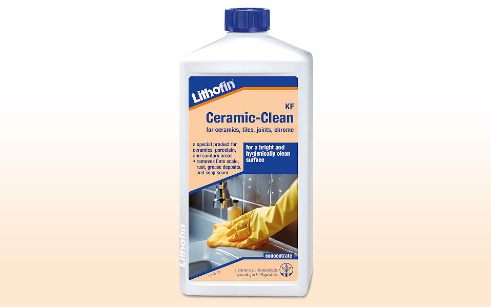 Wipe the fixtures with a wet sponge and a few drops of Lithofin KF Ceramic-Clean (for Australia and New Zealand: Lithofin KF Active-Clean), then simply rinse with water.