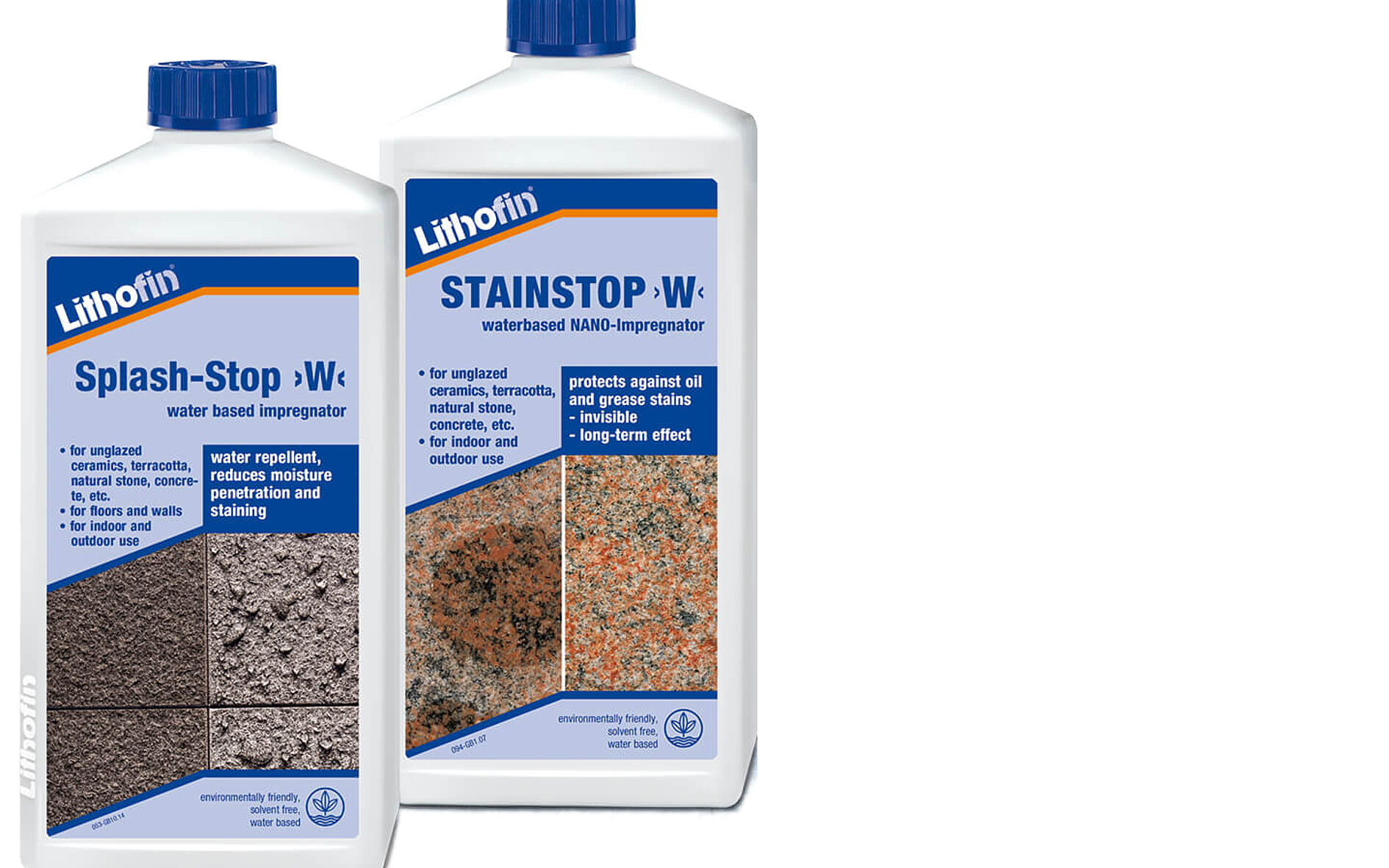 Lithofin STAINSTOP >W< has an oil and water repellent effect and is suitable for intensively used outdoor surfaces. Lithofin Splash-Stop >W<,a purely water-repellent special impregnation, is rather chosen when the surfaces are exposed to light soiling or only moisture. These are in particular paths, walls, cover plates, etc.