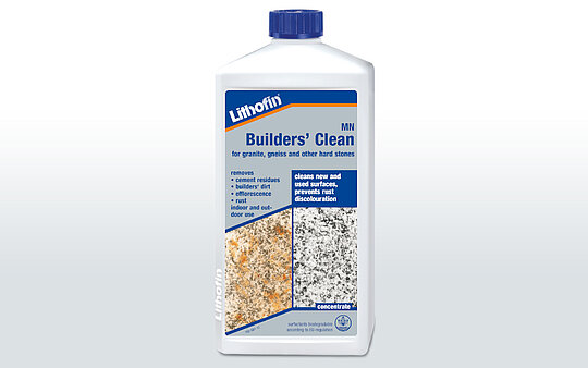 Wet the surface with water, then apply Lithofin MN Builder's Clean and allow it to work for about one hour. Add some water, brush, and then remove the product. Rinse thoroughly with clear water. In case of stubborn staining repeat this process.