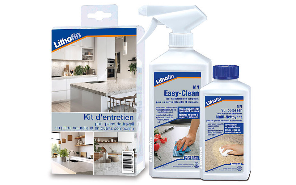 Le kit d'entretien Lithofin contient les produits nécessaires pour la pierre naturelle et le composite de quartz.