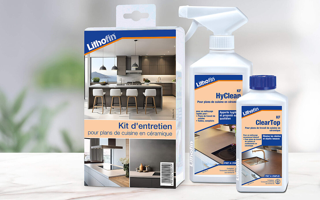 Une fois les surfaces traitées avec les produits Lithofin, les kits d'entretien Lithofin complètent le concept autour de la ProBox. Ainsi, les utilisateurs finaux disposent des produits adéquats pour entretenir leur précieux plan de travail de cuisine, qu'il s'agisse de pierre naturelle, de composite ou de céramique.