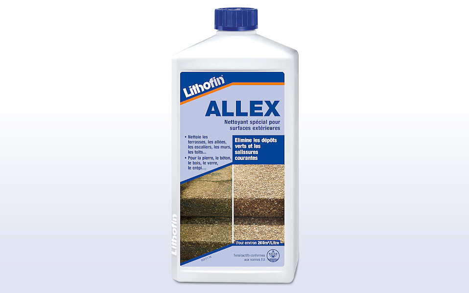 Les algues ou traces de verdissure peuvent être enlevées avec Lithofin ALLEX*. Pour avoir une surface propre, il faut une fois par an vaporiser Lithofin ALLEX*, de préférence au printemps.