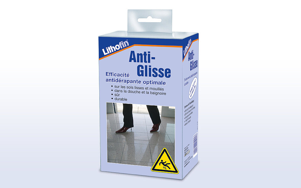 Effectuez d'abord un nettoyage de base. Si la douceur du revêtement de sol est due à des produits d'entretien formant des couches, ce nettoyage suffit à résoudre le problème. Si le sol est encore trop glissant, on peut utiliser du Lithofin Anti-Glisse pour rendre la surface plus antidérapante. Une plus grande rugosité est obtenue en éliminant les plus petites particules de silicate. Lithofin Anti-Glisse est disponible dans un set qui contient tout ce dont vous avez besoin pour une finition antidérapante d'environ 6m².