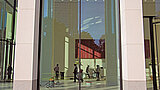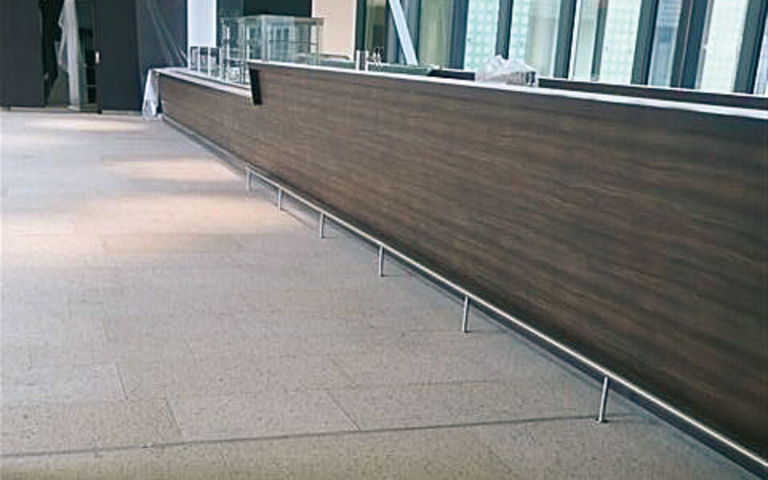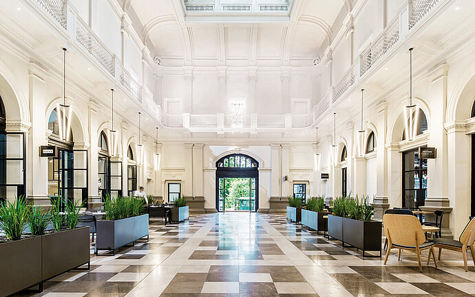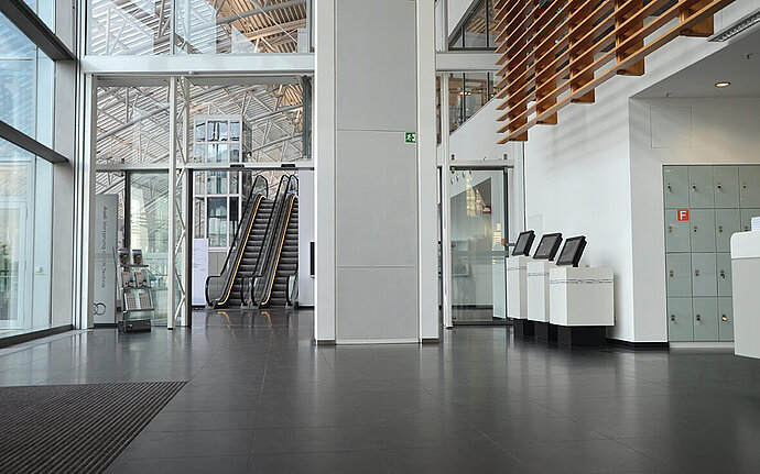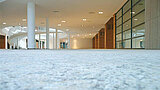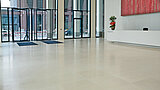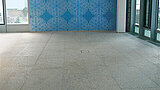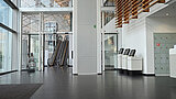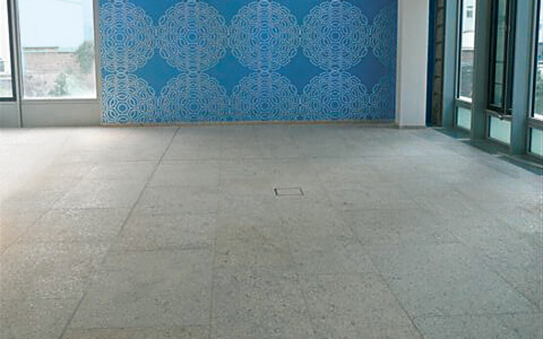 De vloer van de foyer werd ontworpen met Anröchter Grün kalksteen, afkomstig uit Duitsland. De grijsgroene kleurstelling geeft de entree een vleugje puristische elegantie. Om het materiaal effectief te beschermen tegen water-, olie- en vetvlekken, werd op een oppervlakte van ca. 1.000 m² Lithofin VLEKSTOP >W< aangebracht. De impregnering op waterbasis beschermt absorberende keramische, natuur- en betonsteenbekledingen tegen vlekken. Bovendien vergemakkelijkt het de verdere onderhoudszorg.