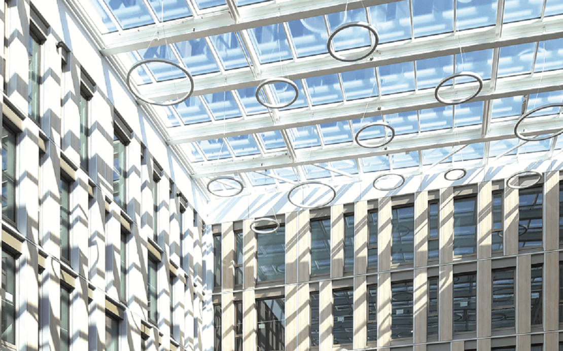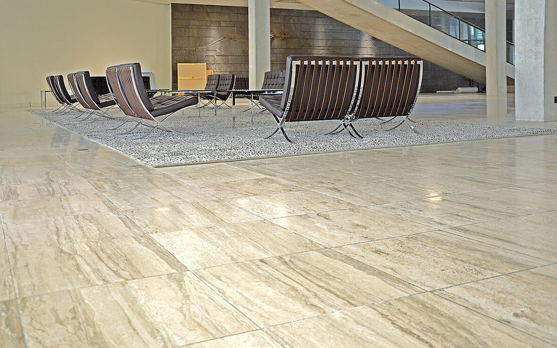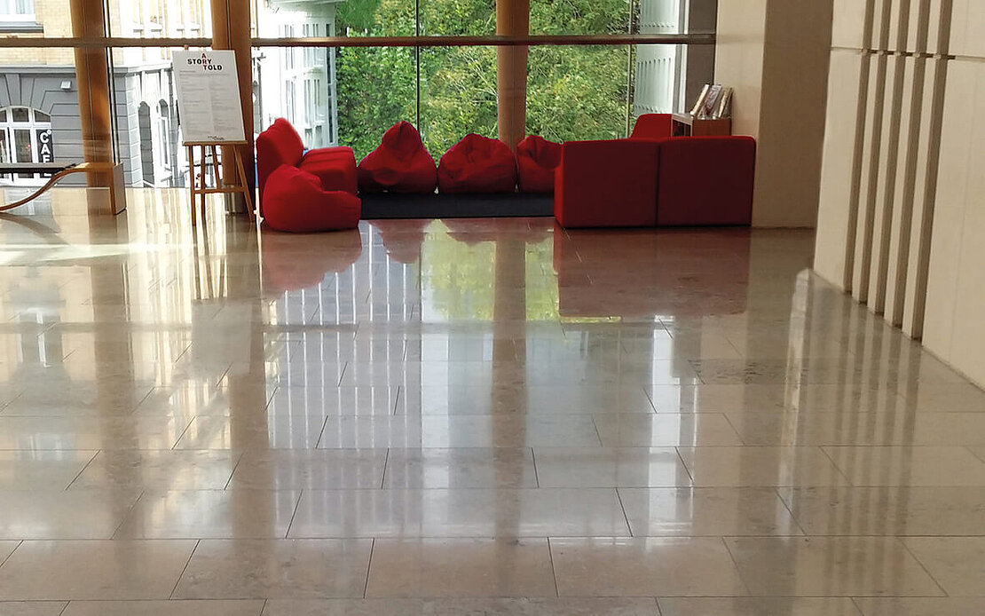 De inkomhal en de lobby zijn ontworpen met Semi Regio kalksteen. Het oppervlak van meer dan 700 m² werd eerst geslepen en dan gereinigd met Lithofin ASR en Lithofin MN Vuiloplosser.
