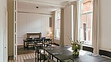 De August is verdeeld over vijf beschermde gebouwen waarvan het oorspronkelijke ontwerp behouden is gebleven door een uitgebreide restauratie van vloertegels, hoge houten plafonds en boogramen. Met eenvoudige vormen, natuurlijke materialen en gedempte kleuren is een moderne en stijlvolle sfeer gecreëerd, die wordt benadrukt door designstukken. Het restaurant is gevestigd in de voormalige kerk, terwijl de keuken zich in het heiligdom bevindt. Tegenwoordig is de bar van het hotel gevestigd in de kloosterkapel, met natuurstenen pilasters langs de muren.