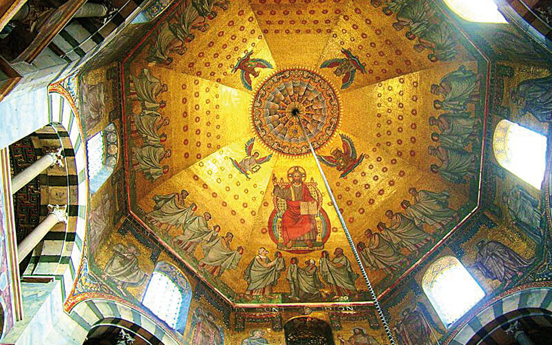 De Dom van Aken is de oudste kathedraal in Noord-Europa. Keizer Karel begon met de bouw van de Paltskapel , het hart van de structuur, op het einde van de 8e eeuw. In deze Dom zijn meer dan 30 koningen gekroond, het is de begraafplaats van Keizer Karel, een belangrijk bedevaartsoord en sinds 1930 de kathedraalkerk van het bisdom van Aken. In 1978 was dit het eerste Duitse gebouw dat werd opgenomen in de UNESCO lijst van Werelderfgoed. Nadat in 2006 de restauratie aan de buitenzijde werd voltooid na een periode van 20 jaar is men begonnen aan de renovatie van het kostbare interieur.