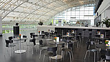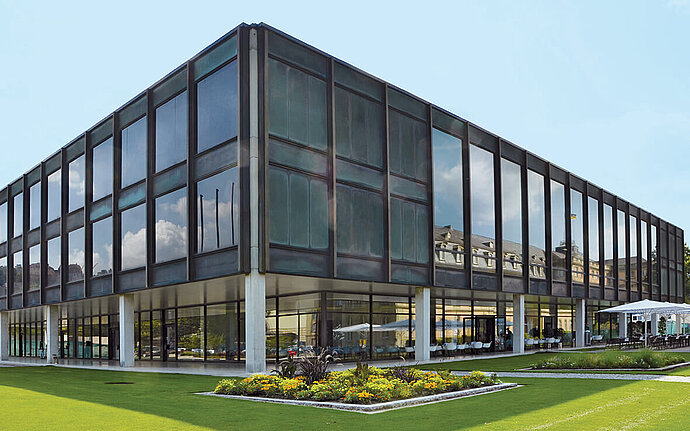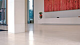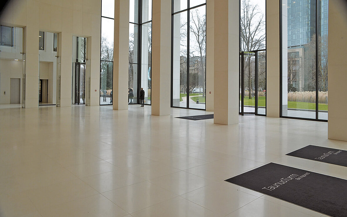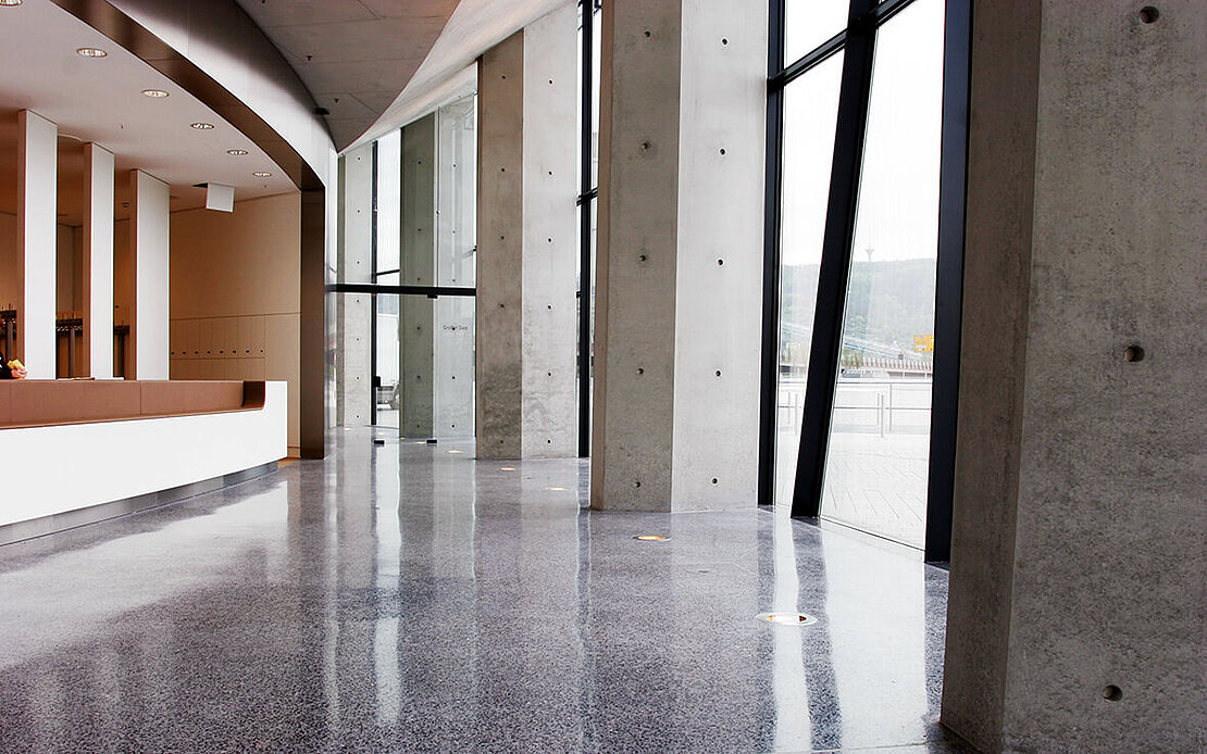 De vloer van de foyer werd ontworpen met Anröchter Grün kalksteen, afkomstig uit Duitsland. De grijsgroene kleurstelling geeft de entree een vleugje puristische elegantie. Om het materiaal effectief te beschermen tegen water-, olie- en vetvlekken, werd op een oppervlakte van ca. 1.000 m² Lithofin STAINSTOP >W< aangebracht. De impregnering op waterbasis beschermt absorberende keramische, natuur- en betonsteenbekledingen tegen vlekken. Bovendien vergemakkelijkt het de verdere onderhoudszorg.