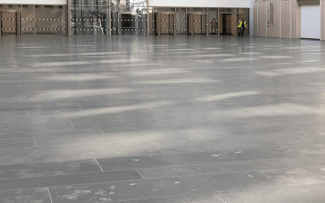Na het machinaal reinigen met een éénschijfsmachine werd Lithofin MN Vuiloplosser toegepast voor het verwijderen van het resterende bouwvuil. Eens zuiver en droog, werden de natuursteen oppervlakken zorgvuldig behandeld met een impregneermiddel.