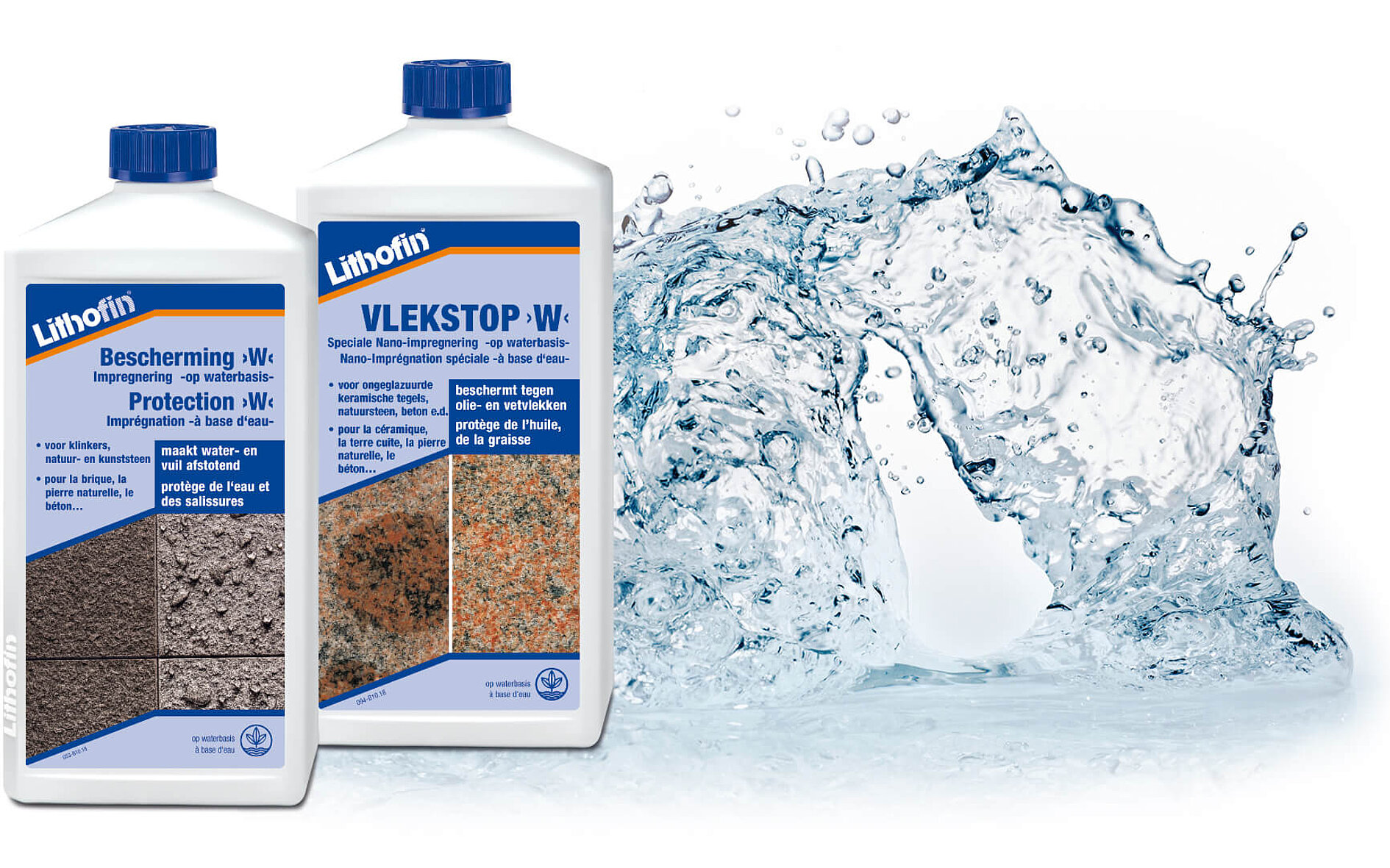 Lithofin STAINSTOP >W< heeft een olie- en waterafstotende werking en is geschikt voor intensief gebruikte buitenoppervlakken. Het product beschermt oa ook tegen vlekken van olie en vet -bbq-. Lithofin Bescherming >W<, een puur waterafstotende speciale impregnering, wordt eerder gekozen wanneer de oppervlakken worden blootgesteld aan lichte vervuiling of alleen vocht. Dit zijn in het bijzonder paden, muren, afdekplaten, enz.