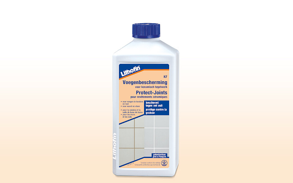 Vetspatten en damp dringen in de poreuze voeg en maken de voeg geleidelijk donker en lelijk. Lithofin KF Voegenreiniger verwijdert dit vuil. Olie en vet verharden echter mettertijd en worden daardoor moeilijker verwijderbaar. Sterk vervuilde voegen kan men ook reinigen met Lithofin KF Intensiefreiniger. De schoongemaakte voegen moeten dan behandeld worden met Lithofin KF Voegenbescherming. Deze beschermende impregnering beschermt tegen het indringen van vet en vuil.