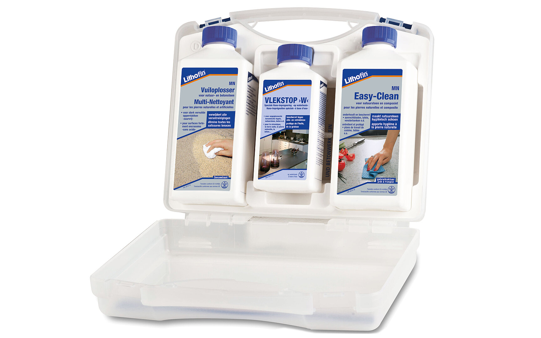 De Lithofin onderhoudsset bevat de nodige producten voor marmer en andere natuurstenen.