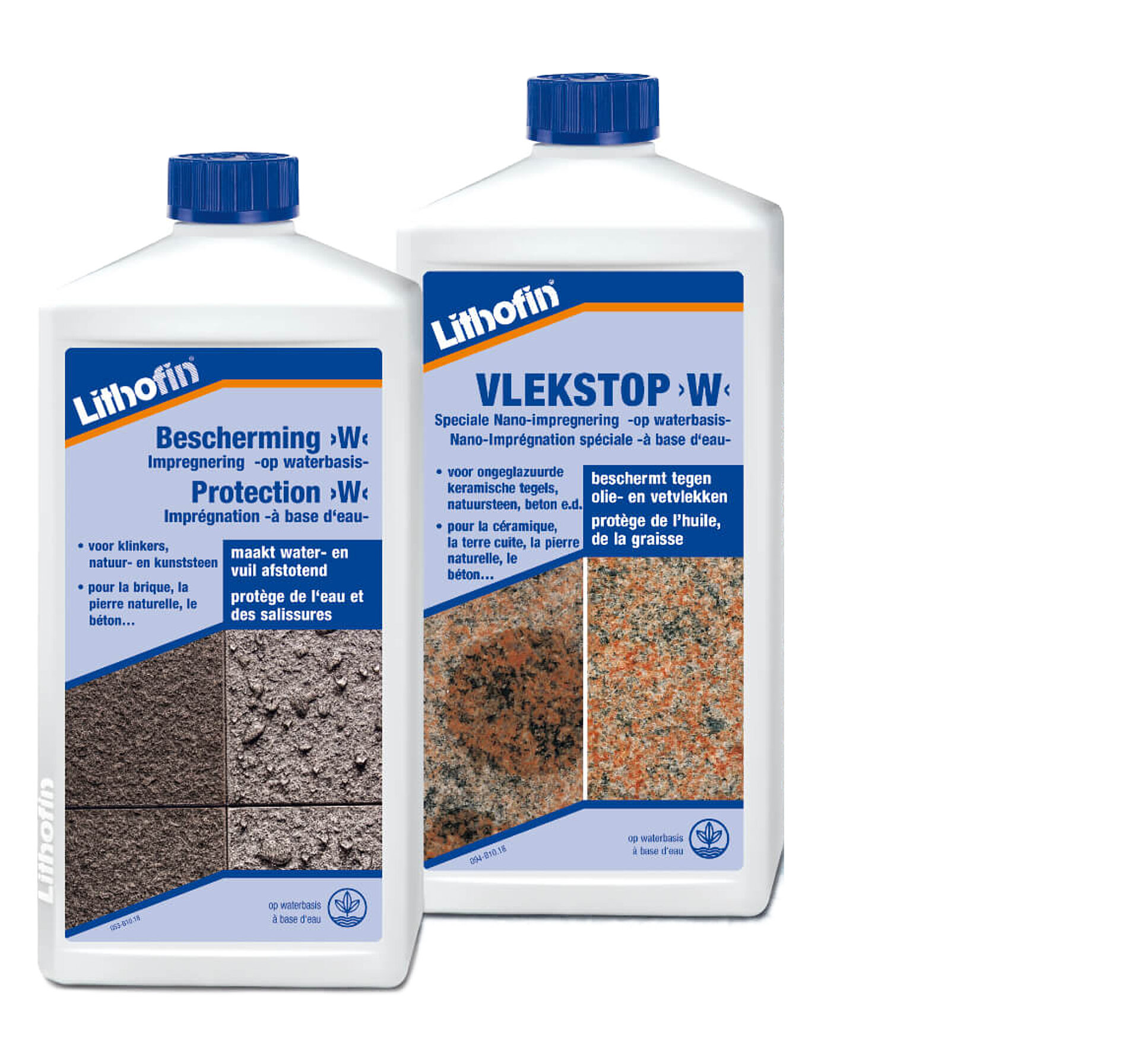 Lithofin STAINSTOP >W< heeft een olie- en waterafstotende werking en is geschikt voor intensief gebruikte buitenoppervlakken. Het product beschermt oa ook tegen vlekken van olie en vet -bbq-. Lithofin Bescherming >W<, een puur waterafstotende speciale impregnering, wordt eerder gekozen wanneer de oppervlakken worden blootgesteld aan lichte vervuiling of alleen vocht. Dit zijn in het bijzonder paden, muren, afdekplaten, enz.