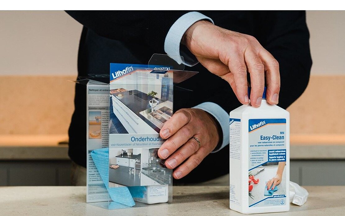 Lithofin onderhoudssets bevatten producten die zijn afgestemd op het toepassingsgebied, zoals keukenwerkbladen, badkamers of vloerbedekking.