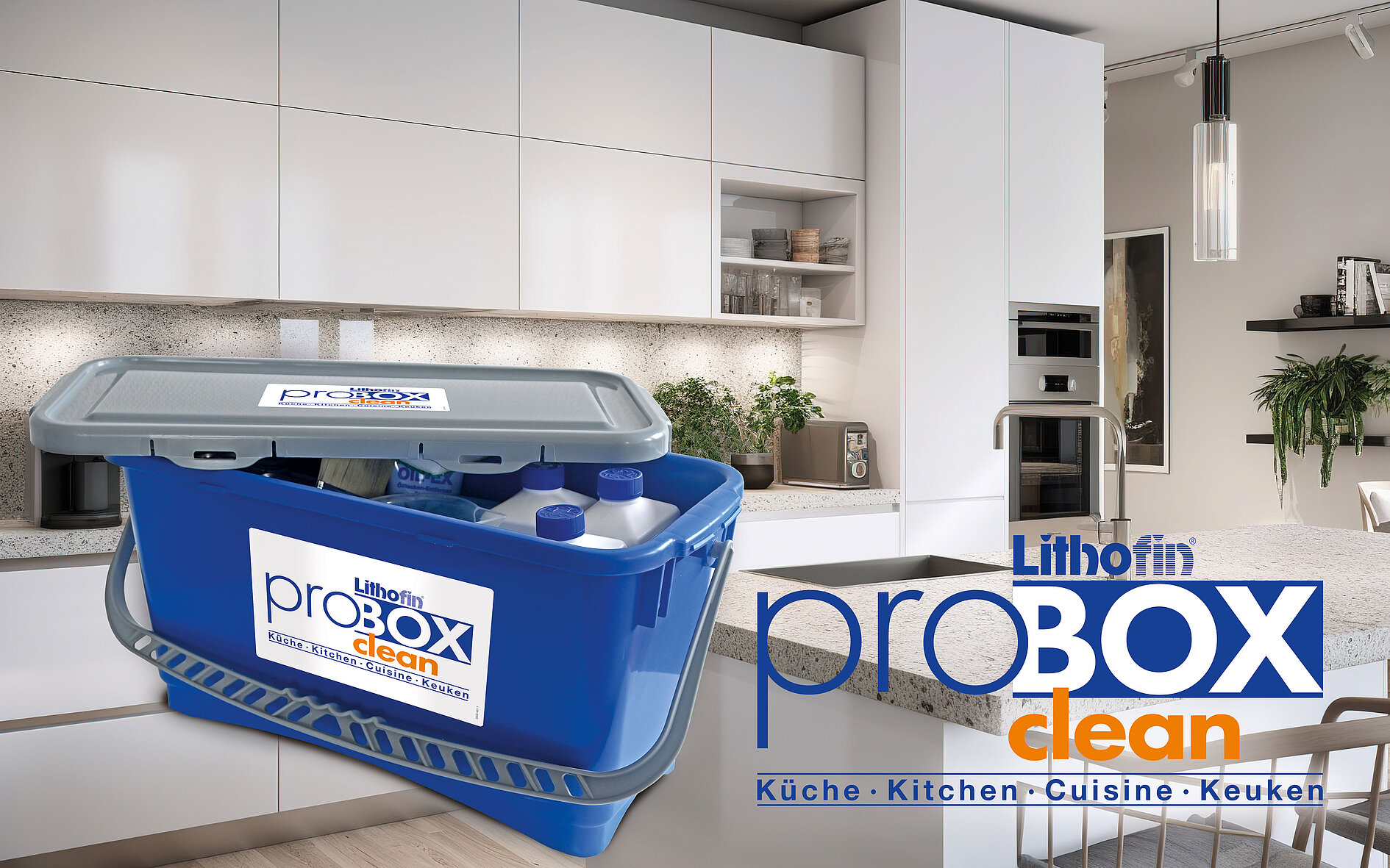 De Lithofin ProBox Clean bevat het uitgebreide productassortiment van speciale reinigers en hulpmiddelen voor de professionele reiniging van keukenwerkbladen uit natuursteen, kwartscomposiet en keramiek. Als servicebox biedt hij keukeninrichters of installateurs de perfecte uitrusting ter plaatse.